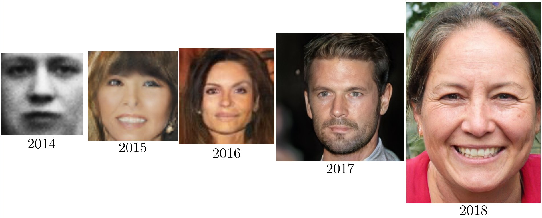 This type of network, presented in 2014 by Ian Goodfellow and his collaborators [Goo+14], has been an enormous step in machine learning. To illustrate that statement, look at this series of generated human faces: