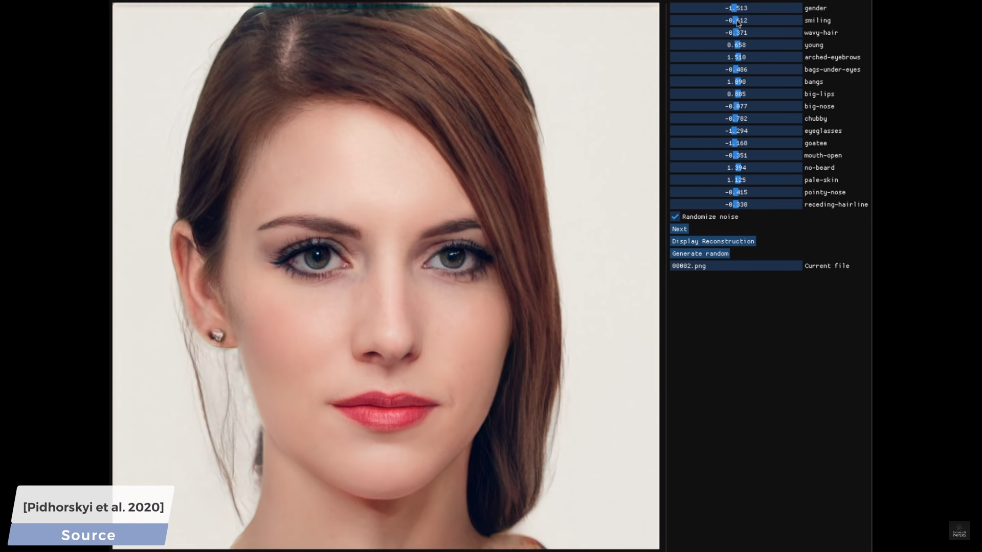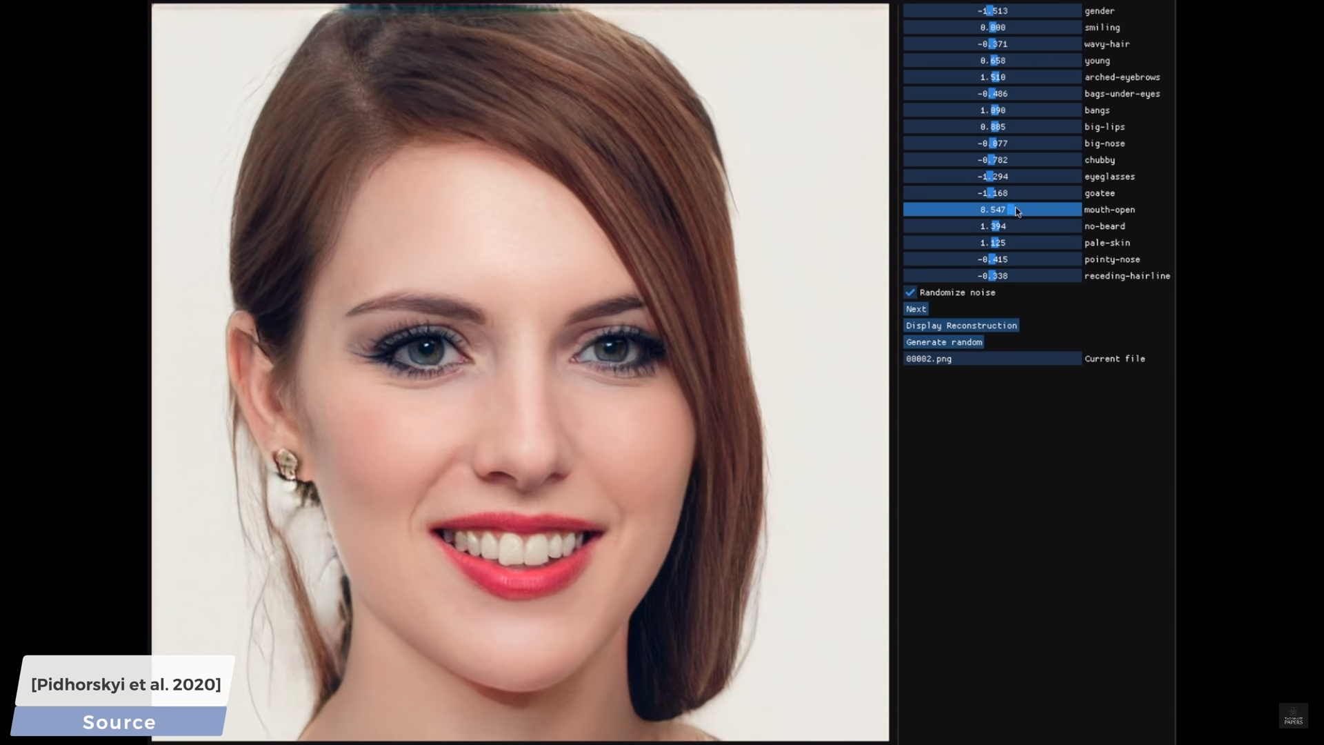 La Figure 2 contient des screenshots d'une vidéo produite par Two Minute Papers sur les ALAEs. Son créateur, Karoly Zsolnai-Fehér, démontre l'usage des curseurs de droite afin de changer les paramètres désirés. Dans le cas des figures 2a et 2b, le curseur mouth-open est changé vers une valeur plus haute. Nous remarquons que les changements des plis du visages sont non seulement présents près de la bouche, mais aussi autour des yeux.