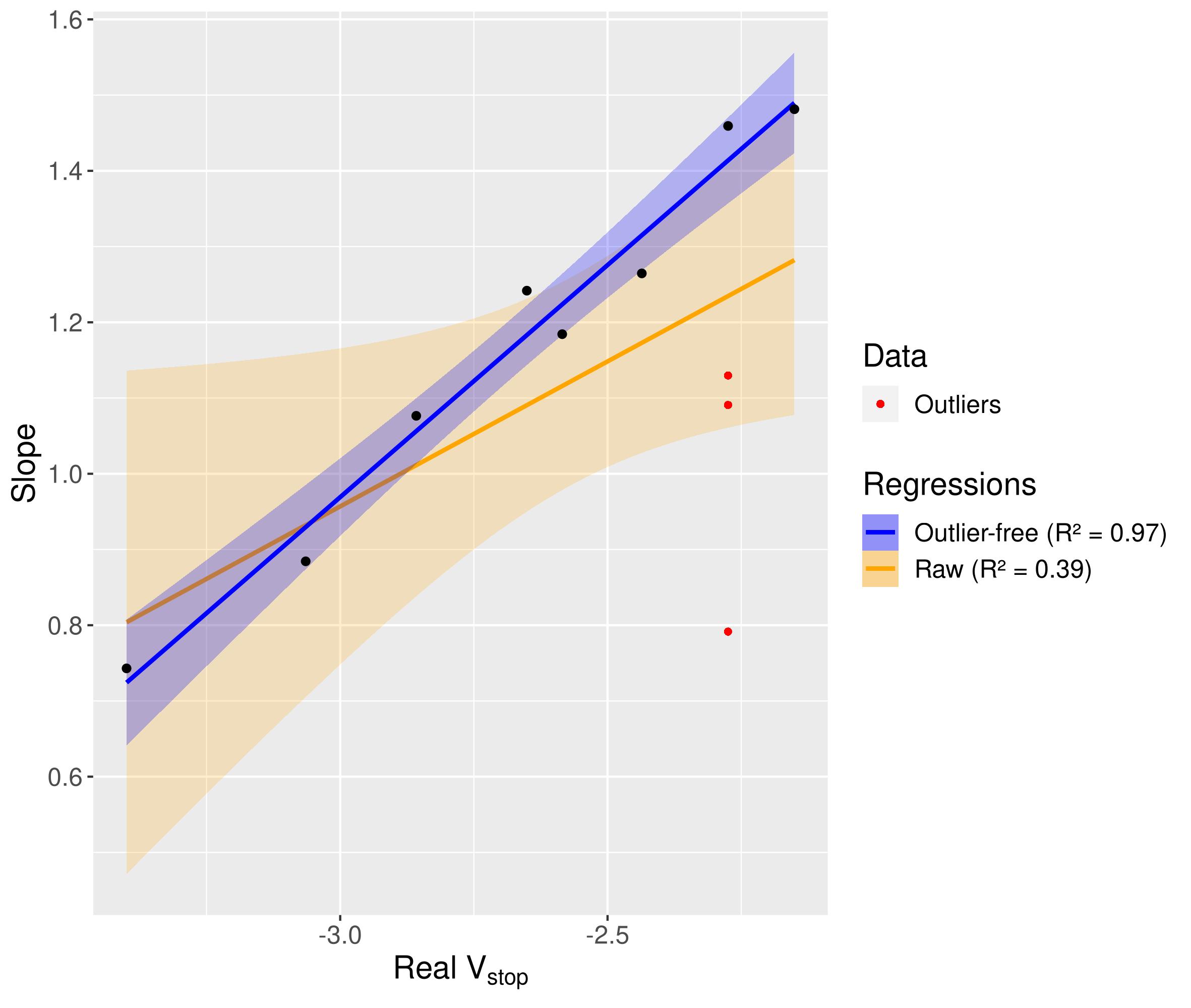 Parce que nous connaissons \(L\), nous pouvons normaliser nos données. La raison pour laquelle cela est fait est de permettre à nos différents ensembles de données d'être comparés. Aussi, à chaque fréquence correspond une et une seule pente 'normalisée'. En effet, à chaque fréquence correspond un \(V_{stop}\) et que l'erreur due à la configuration est constante.